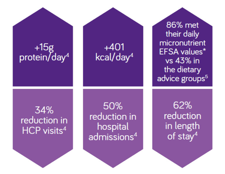 Patients receiving 2x oral nutritional supplements from Fortisip Compact Range per day for 12 weeks had significantly better nutrient intakes and required less healthcare support than those managed with dietary advice alone4,5.