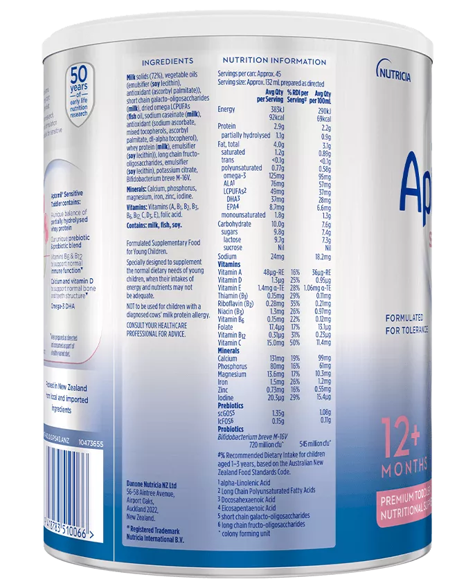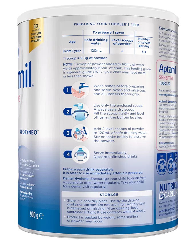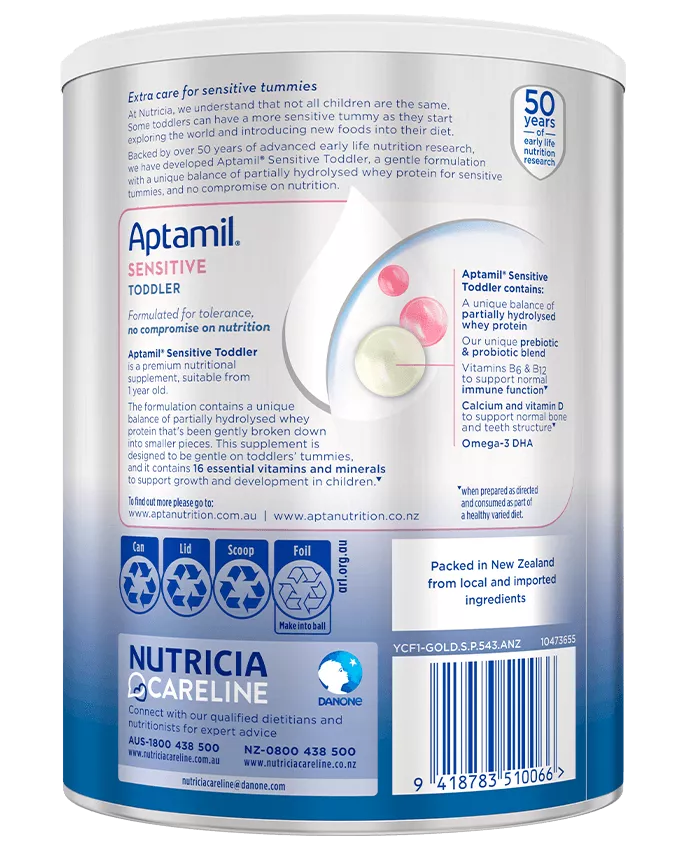 Aptamil® Sensitive Toddler is a premium nutritional supplement, suitable from 1 year, which contains a unique balance of partially hydrolysed whey protein that has been gently broken down into smaller pieces.