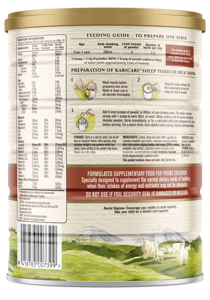 Karicare Toddler sheep Milk Drink Stage 3 is made with the goodness of high-quality sheep milk and Omega 3 DHA. Blended with 16 vitamins and minerals, including Calcium and Vitamin D to help your little one grow and develop normally*. Specially designed to supplement the normal dietary needs of toddlers, when their intake of energy and nutrients may not be adequate.*When prepared as directed and consumed as part of a healthy and varied diet.