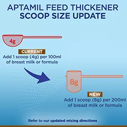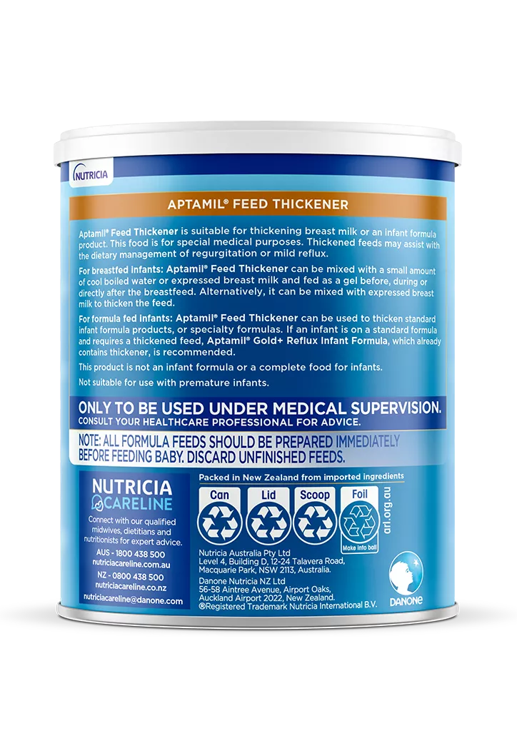 Aptamil® Feed Thickener is a thickening agent and may be mixed with breast milk or infant formula to assist in the management of infant regurgitation or mild reflux. IMPORTANT NOTICE: To be used ONLY in combination with breast milk or infant formula, NOT as a sole source of nutrition. Available in pharmacy without a script in Australia. Available on prescription in New Zealand, FULLY PHARMAC FUNDED.