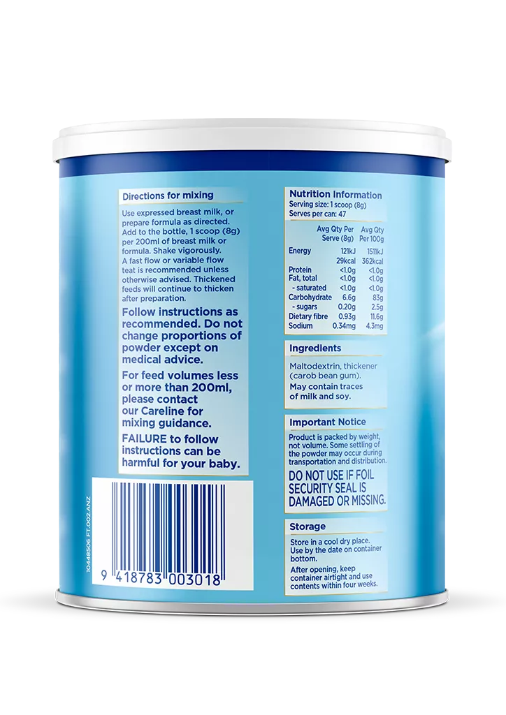 Add to the bottle, 1 scoop (8 g) per 200 ml of breast milk or formula. Shake vigorously. A fast flow or variable flow teat is recommended unless otherwise advised. Thickened feeds will continue to thicken after preparation.