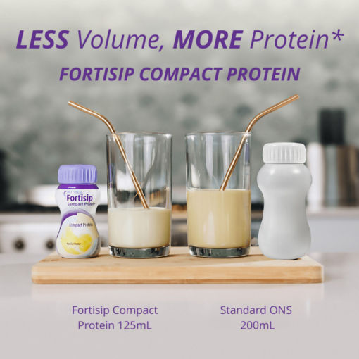 In clinical settings, large ONS volumes may lead to significant wastage, as patients struggle to finish their serving. Fortisip® Compact Protein addresses this by offering a smaller serving size, significantly increasing energy and protein intake.11