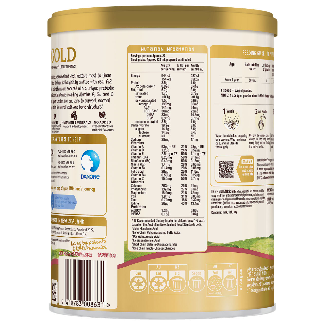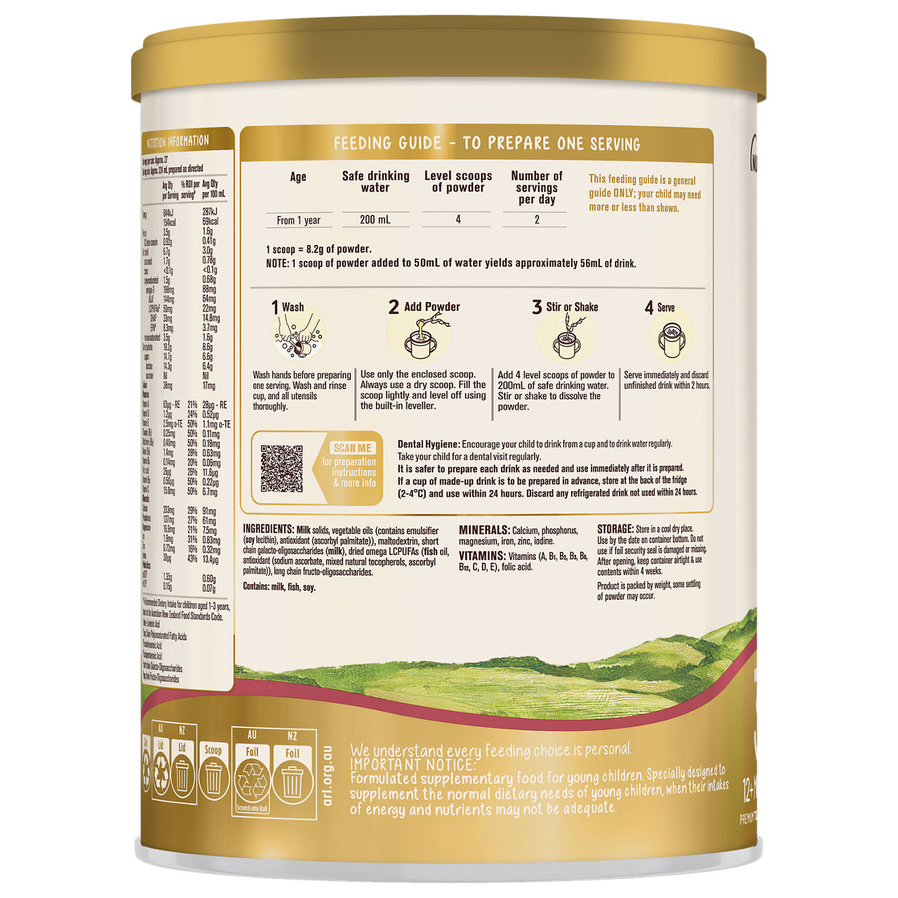 Footnote for Nutrition Information#% Recommended Dietary Intake for children aged 1-3 years, based on the Australian New Zealand Food Standards Code.1 α-Linolenic Acid2 Long chain polyunsaturated fatty acids3 Docosahexaenoic Acid4 Eicosapentaenoic Acid5 short chain Galacto-oligosaccharides6 long chain Fructo-oligosaccharides